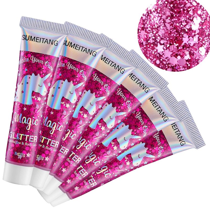 - Stunning Holographic Shades: Elevate your glow with six stunning holographic body glitter gels in White, Silver, Gold, Pink, Blue, and Red. Each shade shifts colors at every angle, creating a mesmerizing, multifaceted shimmer