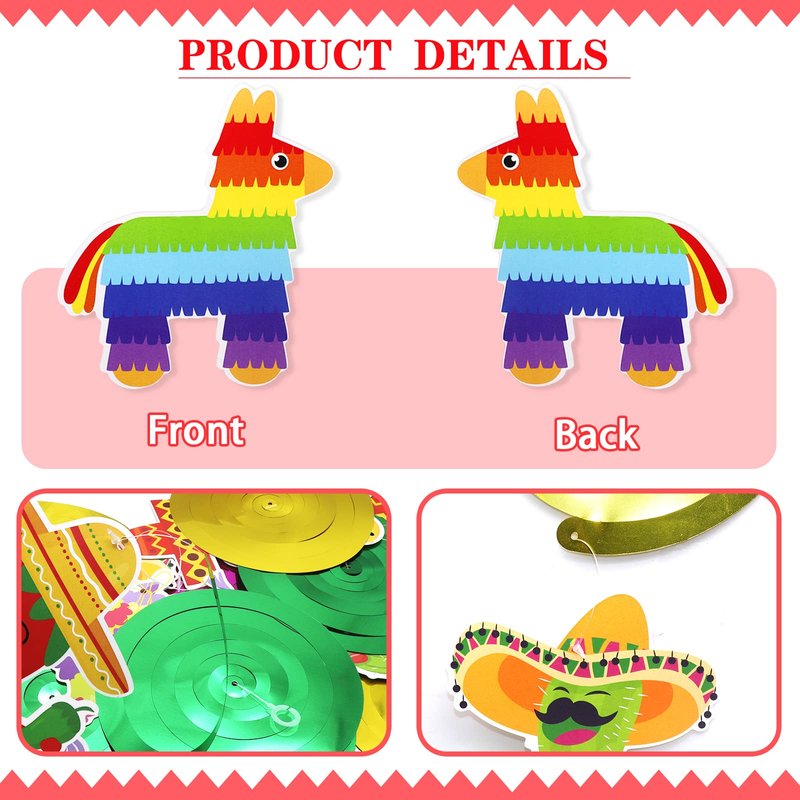 28pack hanging swirls, 16 cutouts card in 8 different Mexican Fiesta Cinco De Mayo shapes Cinco De Mayo party decorations feature assorted Fiesta cutouts (cactus, chili pepper, acoustic guitar, sombrero hat, pinata, lemon drink, taco, Nachos,maracas) Each swirl has a plastic hook for easy hanging. Assembled already! just take it out and enjoy it.