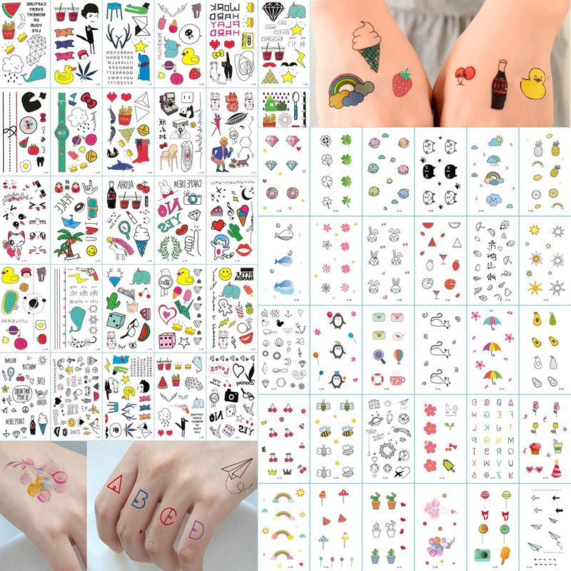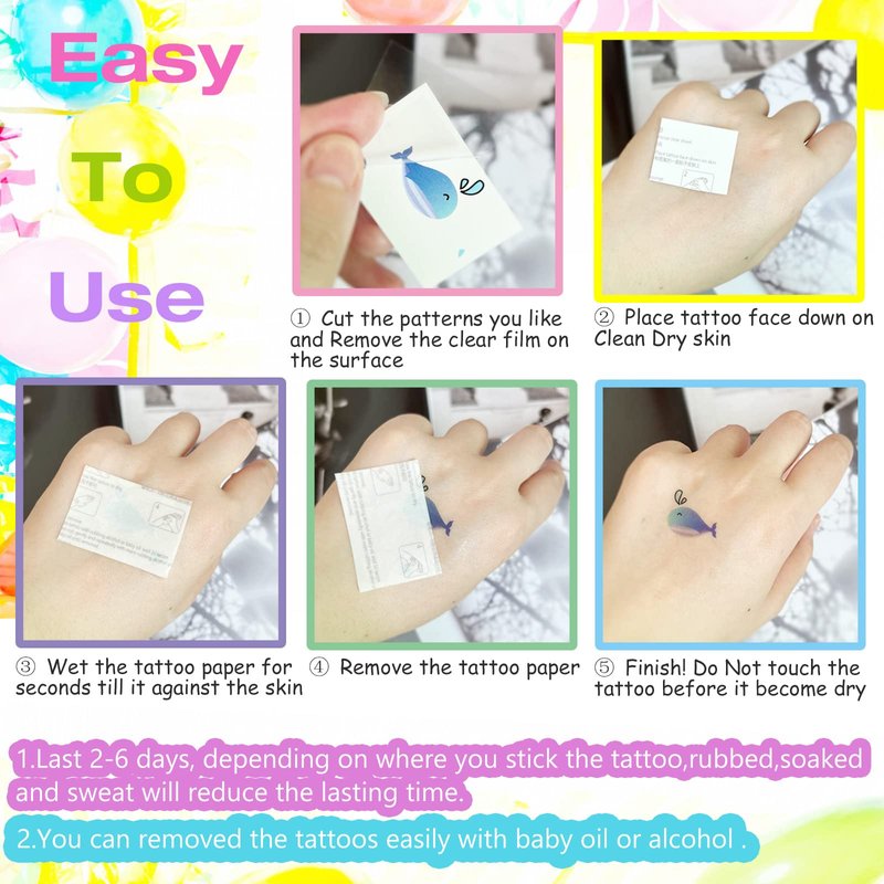 Description: Item Type: Waterproof Summer Temporary Tattoos for Kids Wide application: Perfect for any occasion as party, festival, carnival, family gathering, vacations, beach, picnic etc.; and this kids temporary tattoo is a great choice for party accessories and gift such as birthday parties gifts, party favors for kids, school class carnival prizes and Halloween Christmas party bags gift and bags fillers! Specifications: Quantity: 60 sheets, total 500+ tattoos patterns Size of Sheet: About 10 cm 6 cm ( 3.9 inch 2.3 Inch), each sheet contain 3 to 10 more pieces temporary tattoo Patterns: Animals Ducks, Whales, Cats, Elephants, Rabbits, Bees, Strawberries, Rainbows, Lightning, Stars, Moon, Sun, Planets, Trees, Flowers, Fruits, Pineapples, Watermelons, Crowns, Emoticons, Letters, Balloons Etc. Lasting Time: Usually can last 2-6 days, depending on body parts that you put the temporary tattoo (1 day for finger), rubbed,soaked and sweat will reduce the lasting time. How to Use: Cut out the tattoos patterns you like. Remove the clear film on the surface. Place tattoo face down on Clean Dry skin.(Not recommended for areas with a lot of body hair) Wet the tattoo paper completely with water for seconds, make sure the paper is completely against the skin. Remove the tattoo paper, finish! Warning: Our Temporary Tattoos are made of non-toxic and safe materials,But please avoiding the eye contour area when using and we NOT recommended this item for people with sensitive skin.