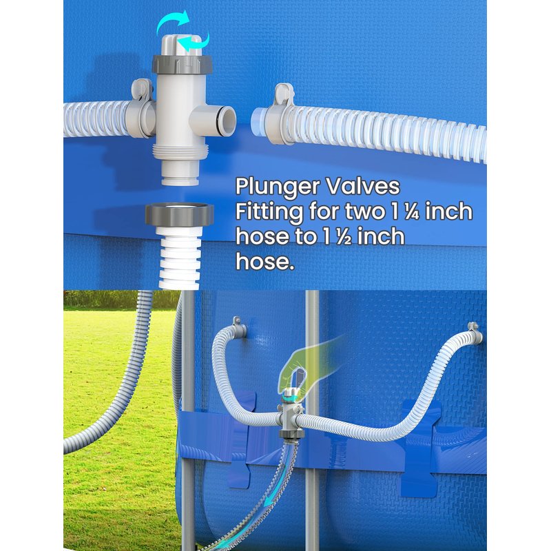 - 【High Efficiency Filtration】SUMMERBUDDY split plunger valve can split the pump suction from a single water outlet to two ports, connect to the pool with two 1.25" hoses, can be more efficient filtering of impurities. 1.5" hose attach to the thread end of plunger valve.