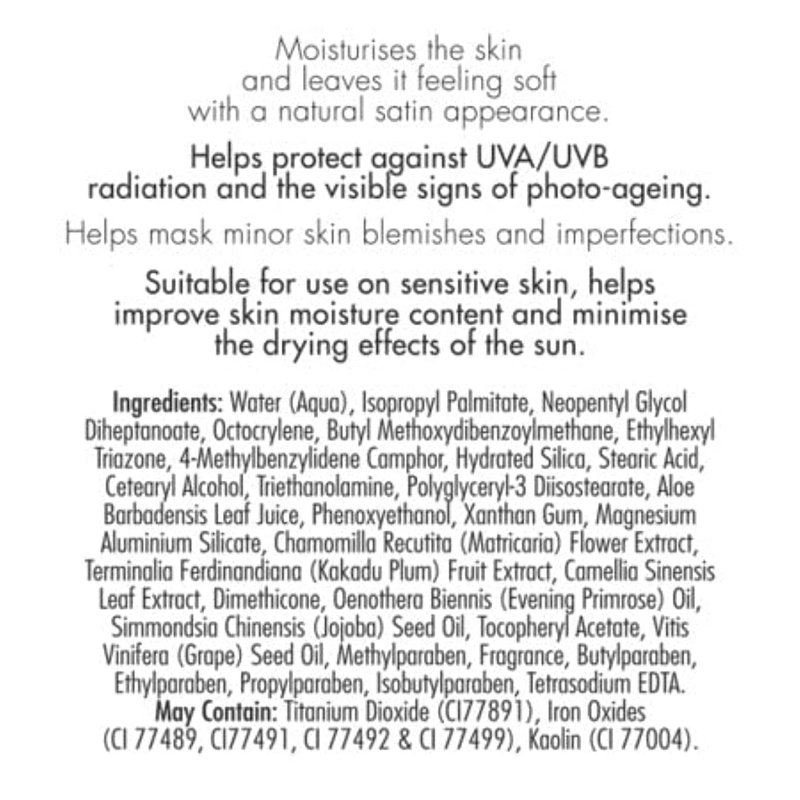 Water (Aqua), Isopropyl Palmitate, Neopentyl Glycol Diheptanoate, Octocrylene, Butyl Methoxydibenzoylmethane, Ethylhexyl Triazone, 4-Methylbenzylidene Camphor, Hydrated Silica, Stearic Acid, Cetearyl Alcohol, Triethanolamine, Polyglyceryl-3 Diisostearate, Aloe Barbadensis Leaf Juice, Phenoxyethanol, Xanthan Gum, Magnesium Aluminium Silicate, Chamomilla Recutita (Matricaria) Flower Extract, Terminalia Ferdinandiana (Kakadu Plum) Fruit Extract, Camellia Sinensis Leaf Extract, Dimethicone, Oenothera Biennis (Evening Primrose) Oil, Simmondsia Chinensis (Jojoba) Seed Oil, Tocopheryl Acetate, Vitis Vinifera (Grape) Seed Oil, Methylparaben, Fragrance, Butylparaben, Ethylparaben, Propylparaben, Isobutylparaben, Tetrasodium EDTA. May Contain: Titanium Dioxide (CI77891), Iron Oxides (CI 77489, CI77491, CI 77492 & CI 77499), Kaolin (CI 77004).
