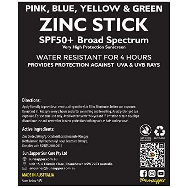 Sun Zapper Zinc Oxide Mineral Sunscreen Stick (Pink, Blue, Green, Yellow) SPF 50+ Water Resistant for Face & Body, Adults, Kids, 4-Pack Broad Spectrum Sun Block, Made in Australia