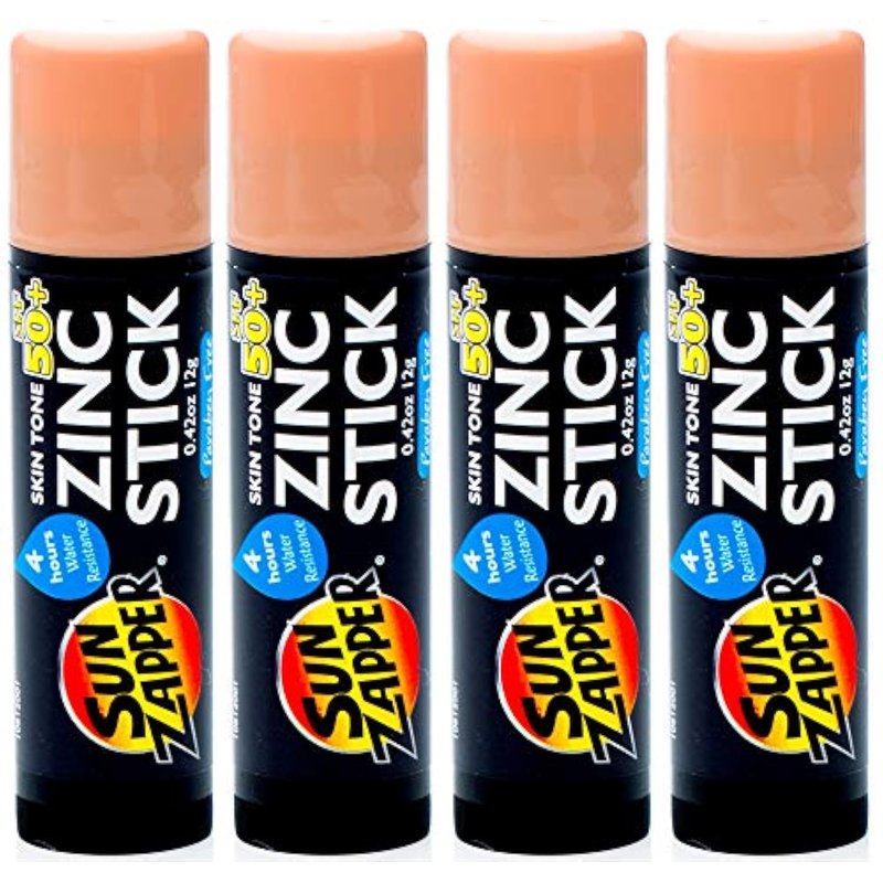 4 Pack of Skin Tone Zinc Sticks 0.42 oz (12g) per stick. The Australian population has trusted Sun Zapper products for more than 18 years. All our sunscreens & zinc sticks are manufactured in Australia to the highest degree of SPF 50+ and all are 4 hours water resistant and are registered with the Therapeutic Goods Administration (TGA). Zinc Oxide acts as a Natural Physical Sun Protection. Contains Vitamin E and Aloe Vera  - Moisturises the skin - Aids to maintain skin elasticity - Helps to fight premature ageing of the skin