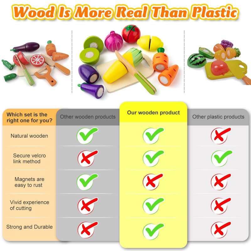 - Perfect Gift For Kids: Exquisite wooden toys are very suitable for kitchen set for kids for toddlers 3 years old. the wooden food is spread out and glued together with nylon buckles, making a "crunchy" sound when the children cut the food toys, toddler kitchen playset which can bring the children a realistic feeling, toddler cooking set is the best gift for preschoolers and toddlers for birthdays, if you are not satisfied, please contact us.