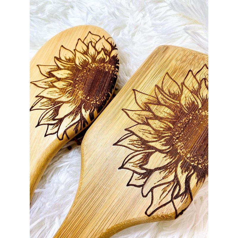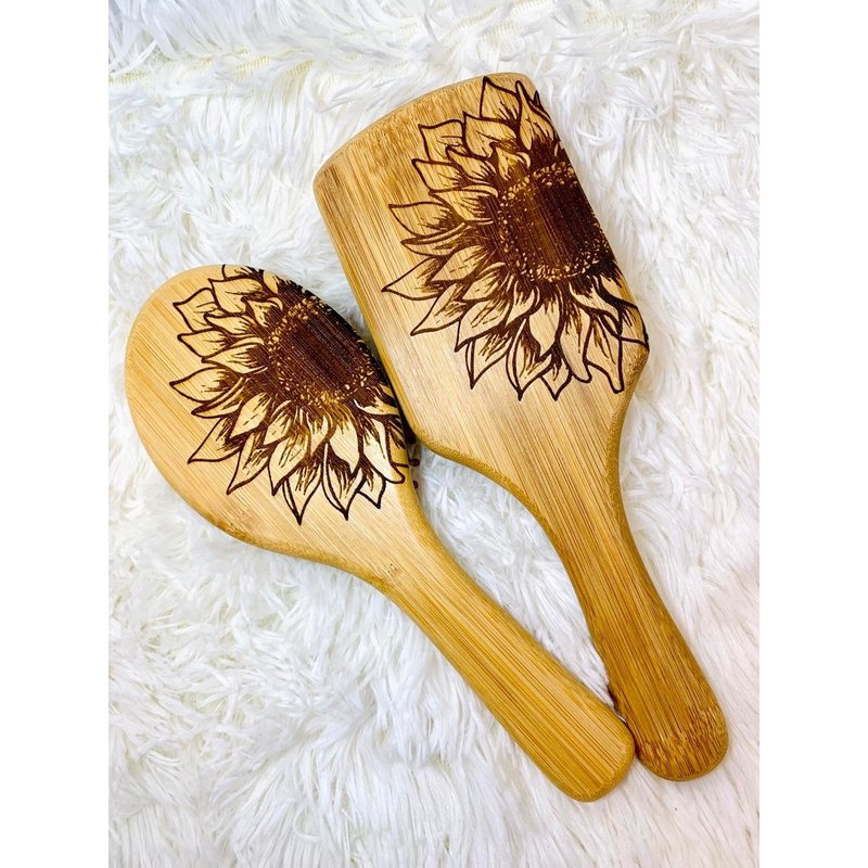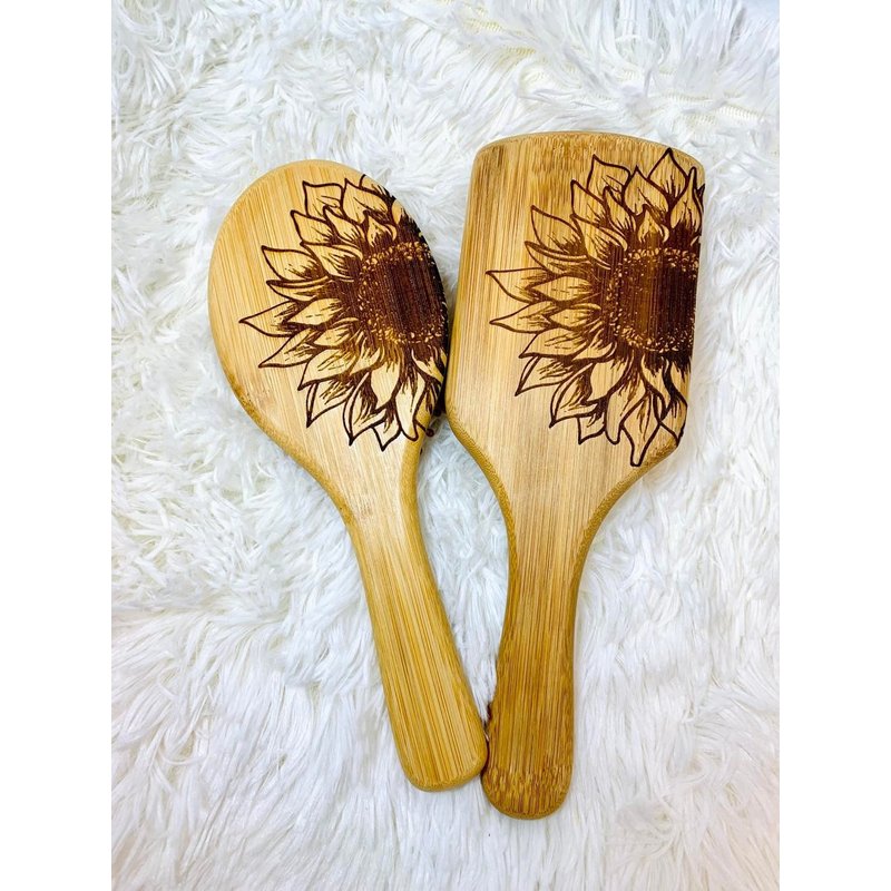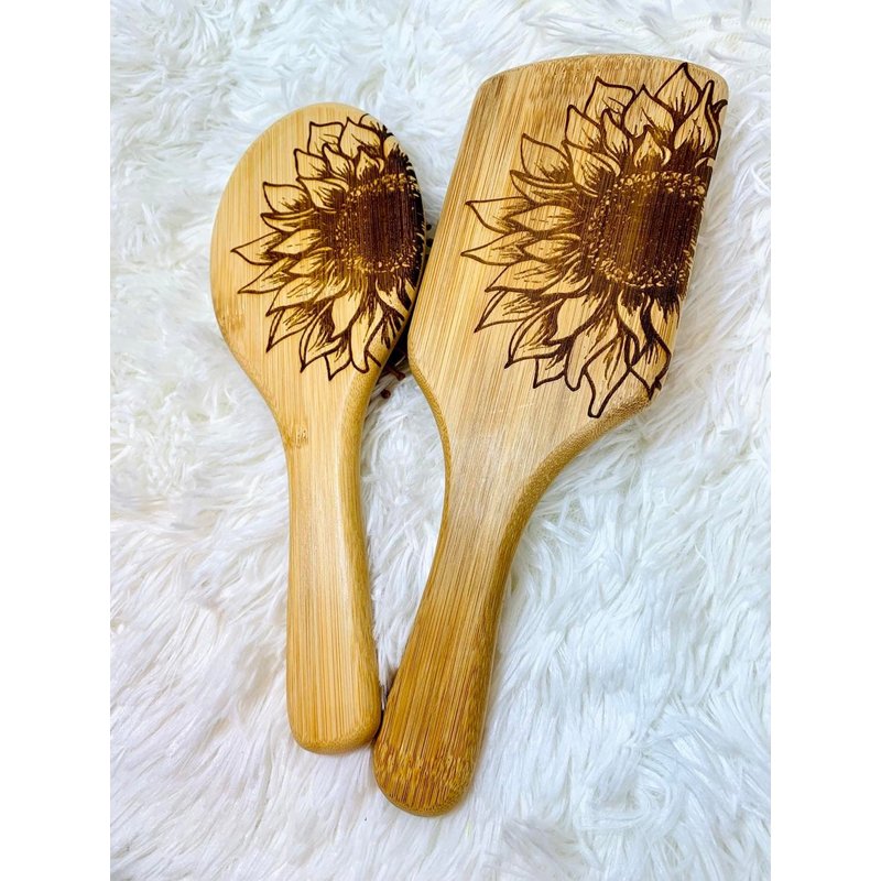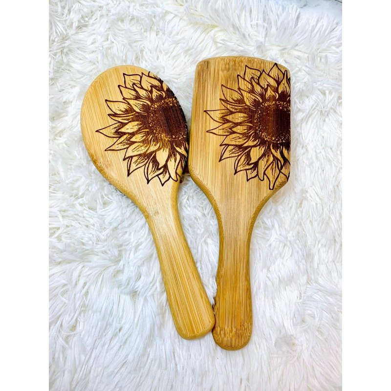 We truly believe that all you need this Natural Sunflower Bamboo Wooden Air Cushion Brush Bamboo Bristle Paddle Brush Detangling Hair Brush , made entirely out of wooden materials that are 100% safe for your hair and scalp and 100% friendly towards our environment! SHINY AND SMOOTH HAIR: With natural bamboo bristles, help to condition your hair naturally, distribute your hair’s natural oils evenly. Your hair will look smooth, shiny and silky! ROUND COMBS TEETH: Bamboo bristles with round ends are much gentler and safer. They penetrate and detangle all types of hair effortlessly without pain. Perfect for elderly adults. MASSAGE SCALP - The cushion base and rounded head bristles massage your scalp to ease tension and stimulate blood flow. A healthy scalp provides your hair follicles with more nutrition so that you will have healthier and balanced hair.Daily use helps prevent hair breakage and seal in split ends. MASSAGE MUSCLE – Can use it to tap shoulders, neck and back to relax stiff muscle. ECO-FRIENDLY - Bamboo paddle and bristles are 100% natural and eco-friendly. Natural bamboo hair brush and natural rubber This hair brushes are made from bamboo and natural rubber, and not only are they a more sustainable option for the environment in terms of them being plastic free (even the cushioning bit) and vegan, they are a better option for healthier, shinier hair. Our Bamboo brush is great for women, men and children with long, curly and luxurious hair! Eliminate frizz and introduce a healthy shine to your hair Detangle your hair with zero pain or effort Stimulate blood flow to hair follicles Hair Type: Curly, Thick, Thin, USA engraved by a small business in New Jersey! since each item is engraved separately there may me slight variations in design due to the bamboo grain.
