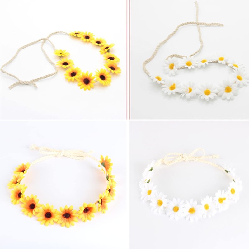 Sunflower Headband Crown, 2PCS Sunflower Flower Headband, Sunflower Hair Wreath Women Girl Bridal Floral Headpiece For Hippie Party Wedding Festivals(White, Yellow)