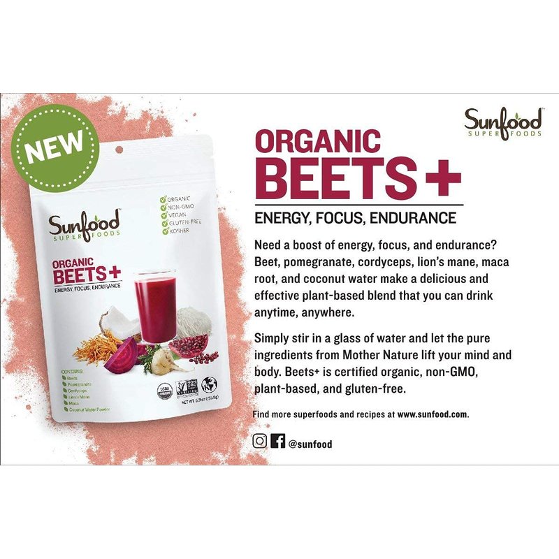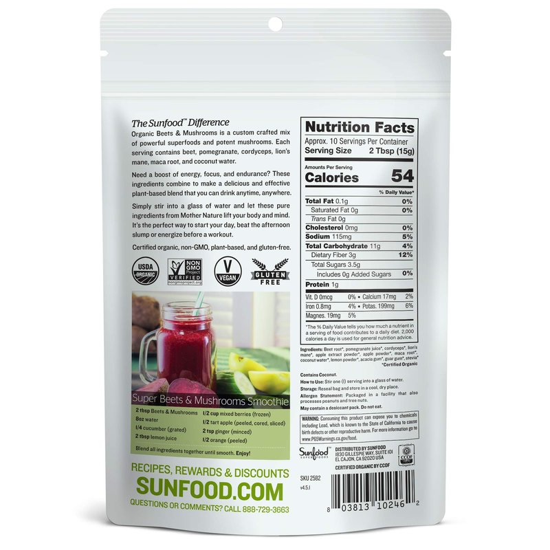 Sunfood Superfoods Organic Beets & Mushrooms Blend with Beetroots, Pomegranate, Cordyceps, & More | 5.31 oz Bag, 10 Servings | Plant-Based Powder Drink Mix | Boost Energy