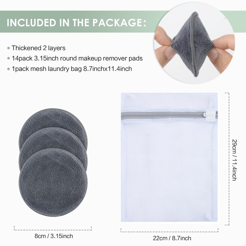 - Package: Included 14 pack 3.15 inch round makeup remover pads and 1 laundry bag .These palm-sized washcloths fit your hands, and the makeup remover pads are made from 80% polyester and 20% polyamide, which are skin-friendly, hypoallergenic and suitable for all skin types