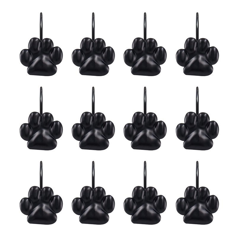 Sunlit Fashion Design Cute Paw Print Polished Shower Curtain Hooks for Dog Cat and Bear, Rust Proof Oil Metal Shower Curtain Rings, Black-12 Pack