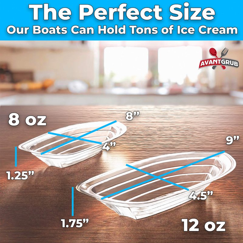 A set of 25 (twenty-five) 8-ounce clear, plastic banana split boats, plus a set of 25 (twenty-five) 12-ounce boats. Each 8 oz. boat measures 8 In. x 4 In. x 1.25 In. Each 12 oz. boat measures 9 In. x 4.5 In. x 1.75 In.