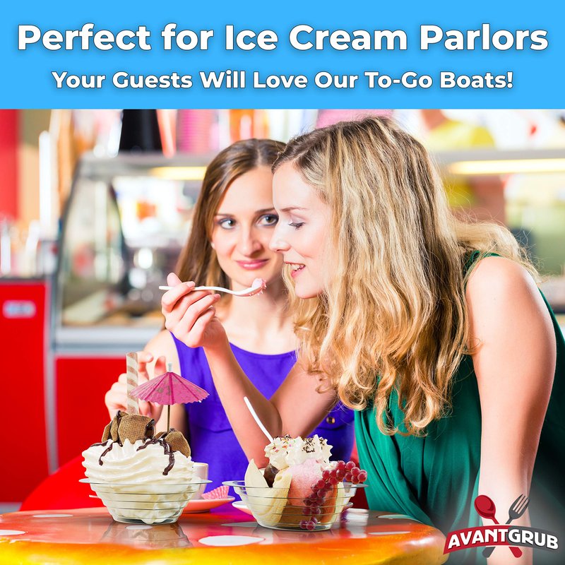 - ULTRA PORTABLE CONTAINERS ARE GREAT FOR BUSINESSES, TOO. Save time and money with our bulk ice cream boat supplies that include lids. Guests of any restaurant or ice cream parlor will love taking their dessert to go with our fun, sturdy boats!
