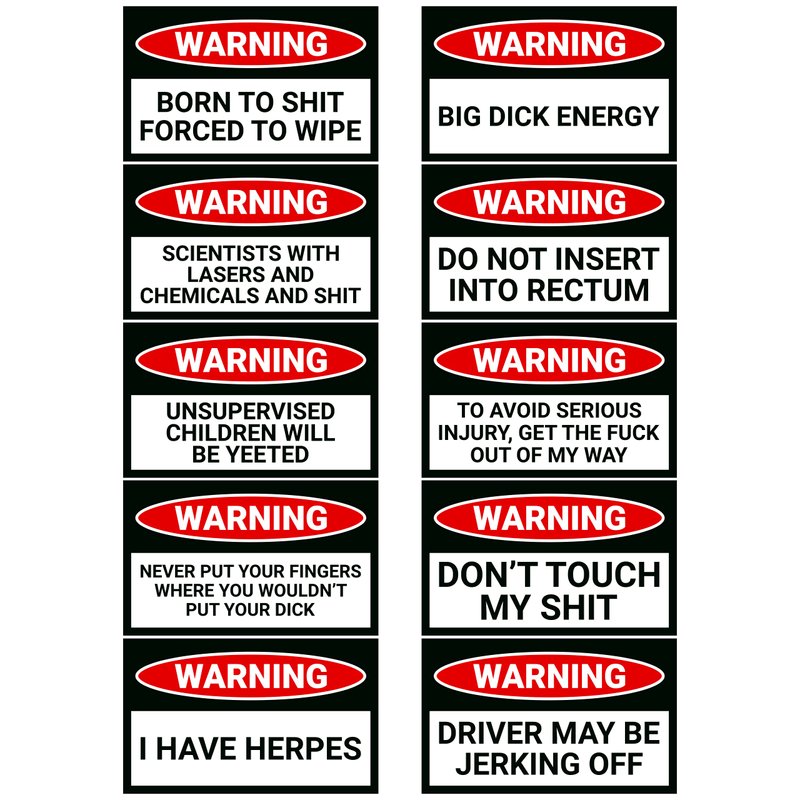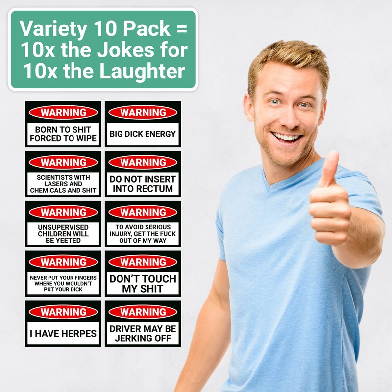 Super Funny, Variety 10 Pack Warning Sticker - 3x5 Inch Vinyl Gag Bumper Stickers for Car, Truck, or Van - Hilarious, Fun, and Dirty Adult Practical Joke Prank Decals - Trick Your Friends and Enemies