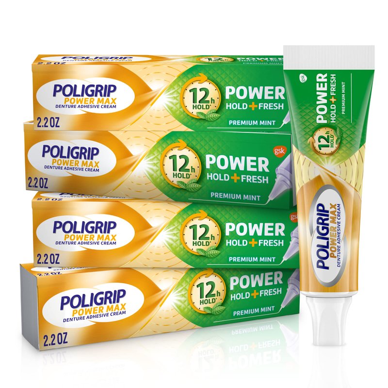 - Four pack of 2.2 oz tubes of Poligrip Power Max Power Hold plus Fresh Denture cream with Premium Peppermint flavor and aromatic spearmint oils