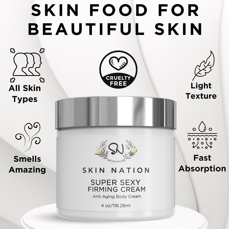 Elevate Your Skin Care with Skin Nation's Super Sexy Firming Cream Body Lotion In the realm of skin care products, finding the perfect product that not only moisturizes but also firms and nourishes your skin can be quite a challenge. However, Skin Nation's skin firming and tightening lotion is here to revolutionize your daily body skin care products. With a host of skin-loving ingredients, this lotion is more than just a moisturizer. Let's explore the sensational features and benefits that make this lotion a must-have for body care. Nourishing Lotion for Dry Skin For those dealing with dry skin, Skin Nation's Super Sexy Firming Cream Body Lotion is a lifesaver. It delivers deep hydration to combat dryness, leaving your skin feeling soft and rejuvenated. It's the perfect lotion for dry skin, ensuring a silky-smooth feel. Firming and Tightening Power If you're looking to enhance skin firmness and combat the signs of aging, this body lotion has got you covered. It acts as a skin tightening cream for body, working to restore elasticity and firmness to your skin. As an anti wrinkle cream, it also helps reduce the appearance of fine lines, leaving your skin looking more youthful. Also works as an excellent neck cream. Silky Smooth Luxury Our cream doesn't just moisturize; it pampers your skin with a luxurious feel. It's like a body cream that melts into your skin, leaving it feeling smooth and velvety. Say Goodbye to Cellulite Are you looking to reduce the appearance of cellulite on your thighs? This lotion can help. It functions as a cellulite cream for thighs, making it an excellent choice for those wanting smoother, firmer skin. Lotion for Women or Mens Lotion This body lotion for women and men is a versatile skin care product that delivers results no matter your gender. In conclusion, Skin Nation's Super Sexy Firming Cream Body Lotion is a comprehensive skin food that combines deep hydration, skin firming, and anti-aging properties.