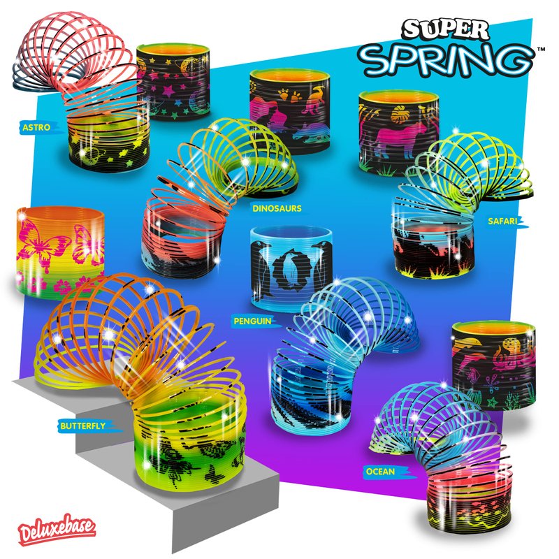 𝐒𝐮𝐩𝐞𝐫 𝐒𝐩𝐫𝐢𝐧𝐠 - Dino from Deluxebase. A plastic slinky toy which will be the ultimate source of endless fun for your child. The vibrant and captivating spring dinosaur toy will keep your kid entertained for hours with its bright colors and delightful patterns. Watch in awe as they bounce down the stairs like magic! The attractive rainbow toy with a Jurassic print has a dimension of 2.76 x 2.76 x 2.56 inches making for great small party favors and birthday gifts for kids. The fidget toy is available in 7 colorful novelty styles including safari spring, butterfly spring, ocean spring, dino spring, penguin spring, astro space spring. Find your favourite plastic slinky or collect them all and have races down your stairs!