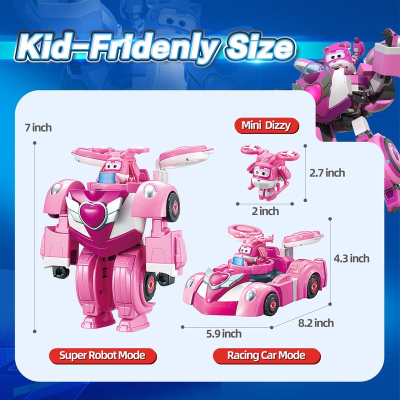 Super Wings Transformer Toys, 7" Super Robot and 2" Mini Dizzy Transforming Suit, 2 in 1 Car Robot Toys Action Figure, Racing Cars Playset for Boys and Girls Age 3+, Gifts for Preschool Kids, Pink