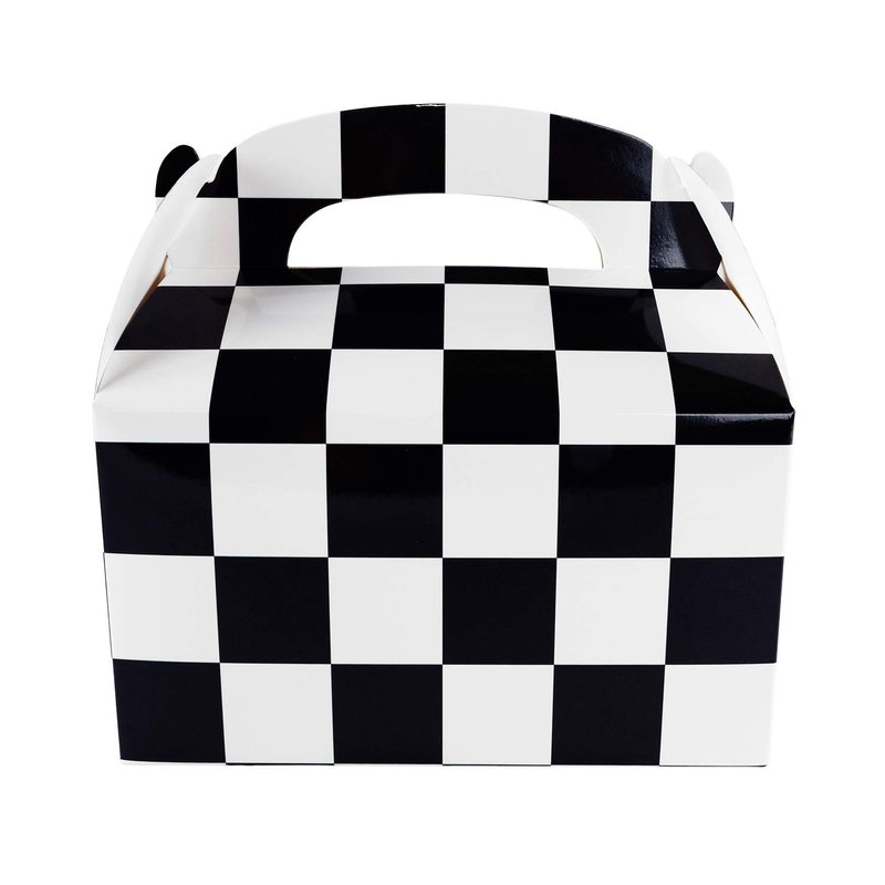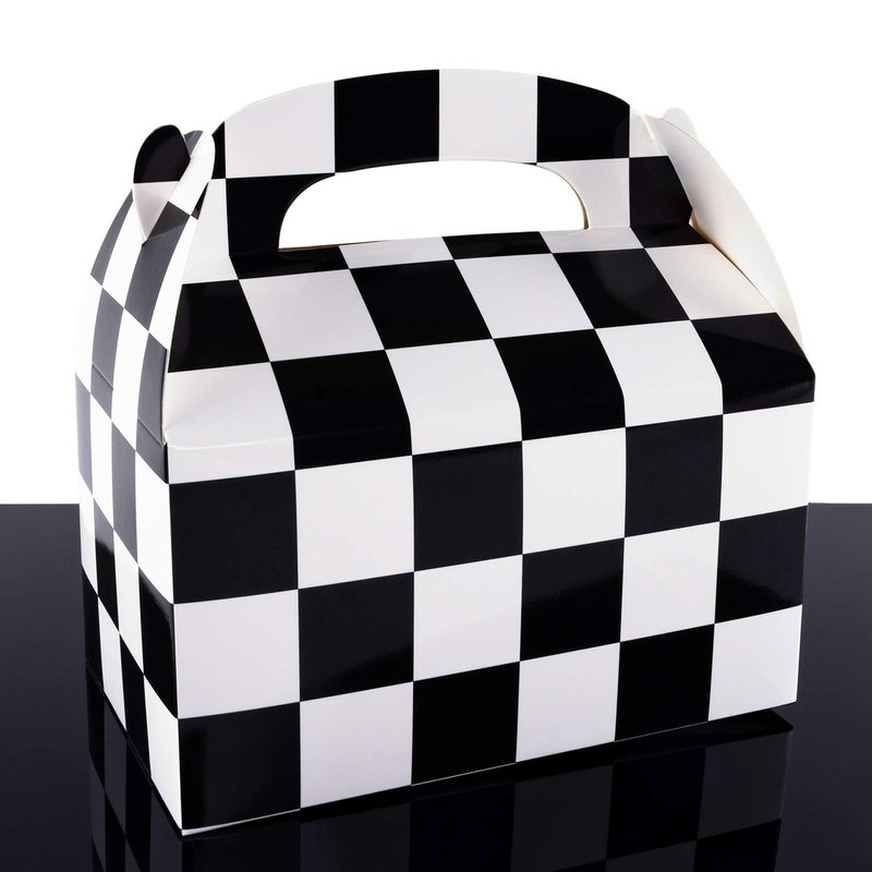 - Fill up these black and white checkered race track treat boxes with favors for your guests at your next birthday party or any other event. Easily to match them with carnival decorations, celebrate with pinatas for birthday party, add birthday party balloons and kids party favors. The possibilities are endless as you can suit the paper boxes to your needs.