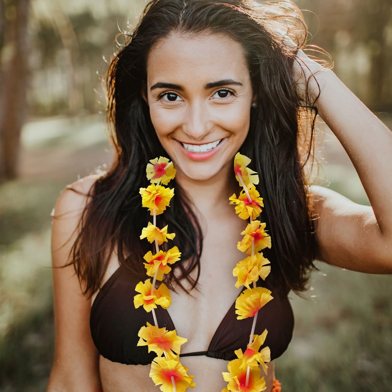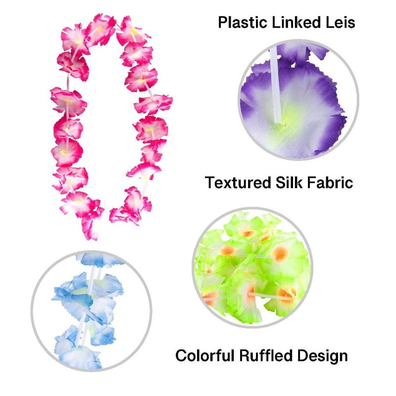 - Your guests will love adding them to their Hawaiian accessories! Coordinate them with colorful hawaiian shirts, bikinis, beach wear, and summer boardshorts. Textured with comfortable silk fabric and bright color flower designs that will make you say Aloha! This package of simulated silk leis tropical decor flower necklaces with be a fashionable hit.
