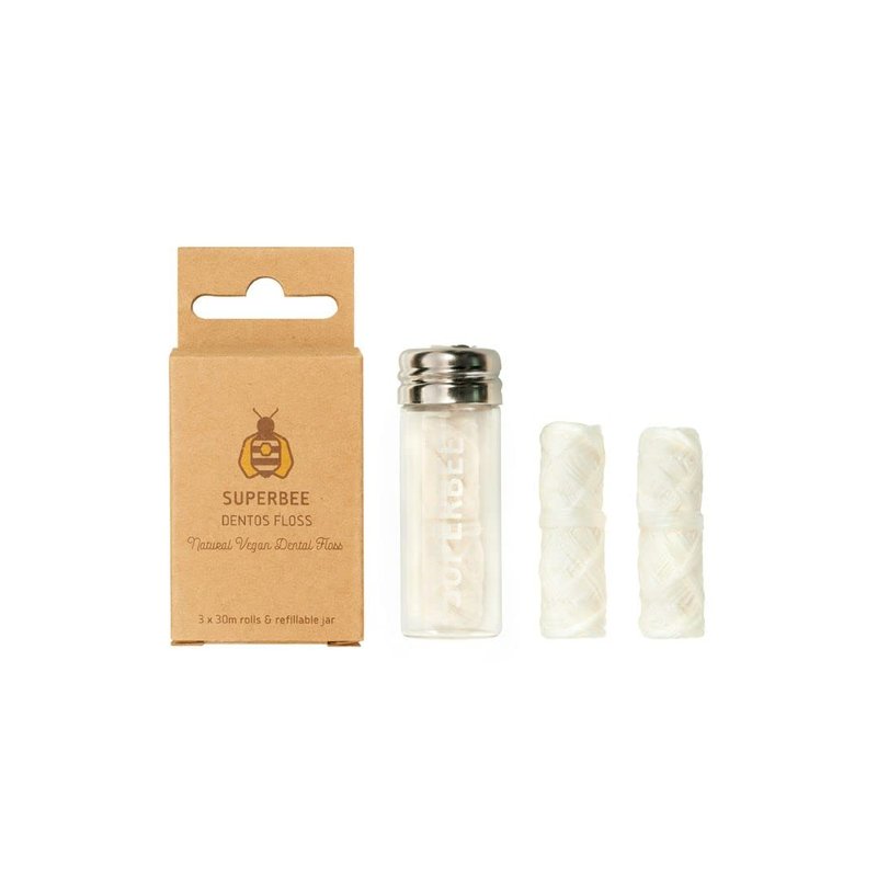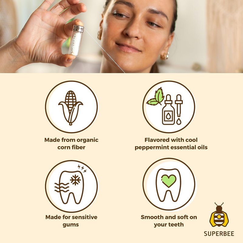 SuperBee Dentos Floss, 3 spools Dental Floss, Vegan and Natural Corn Fiber Floss, for Sensitive Gums Kids and Adults, Peppermint Flavored Natural Floss, Natural Dental Floss, Oral Care Routine