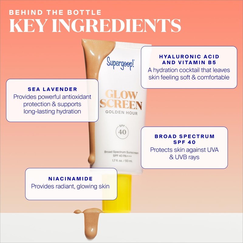 - MULTITASKING SUNSCREEN - Supergoop! Glowscreen is a broad spectrum sunscreen with SPF 40 that helps filter blue light and doubles as a makeup-gripping primer for dewy, glowing skin that isn’t greasy or oily—and now it comes in four radiant shades!