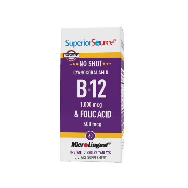 Superior Source No Shot Vitamin B12 Cyanocobalamin (1000 mcg), Folic Acid (400 mcg), Quick Dissolve MicroLingual Tablets, 60 Ct, Increase Energy, Boost Metabolism, Heart and Stress Support, Non-GMO