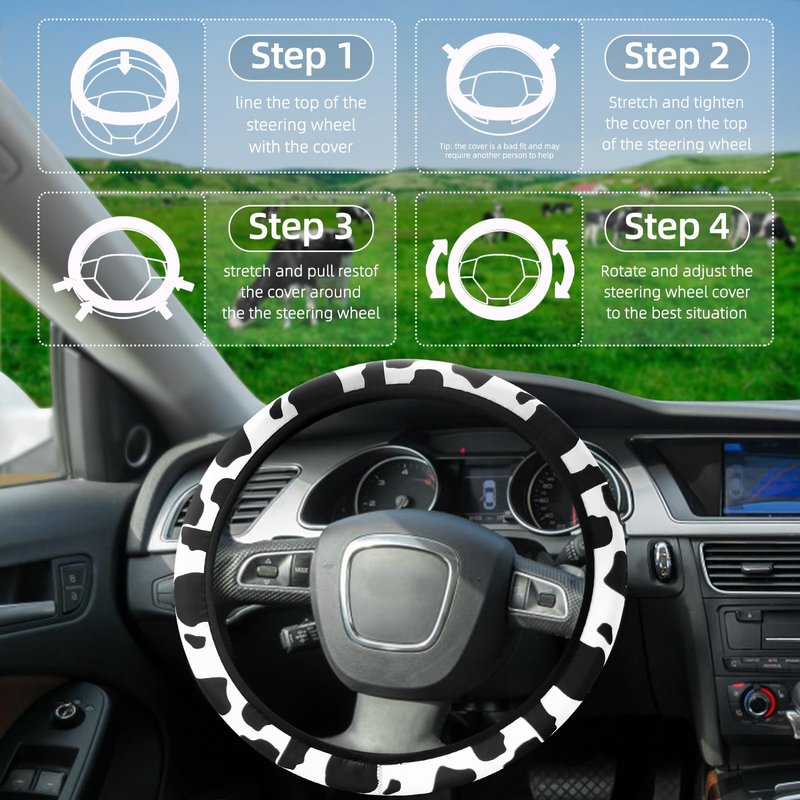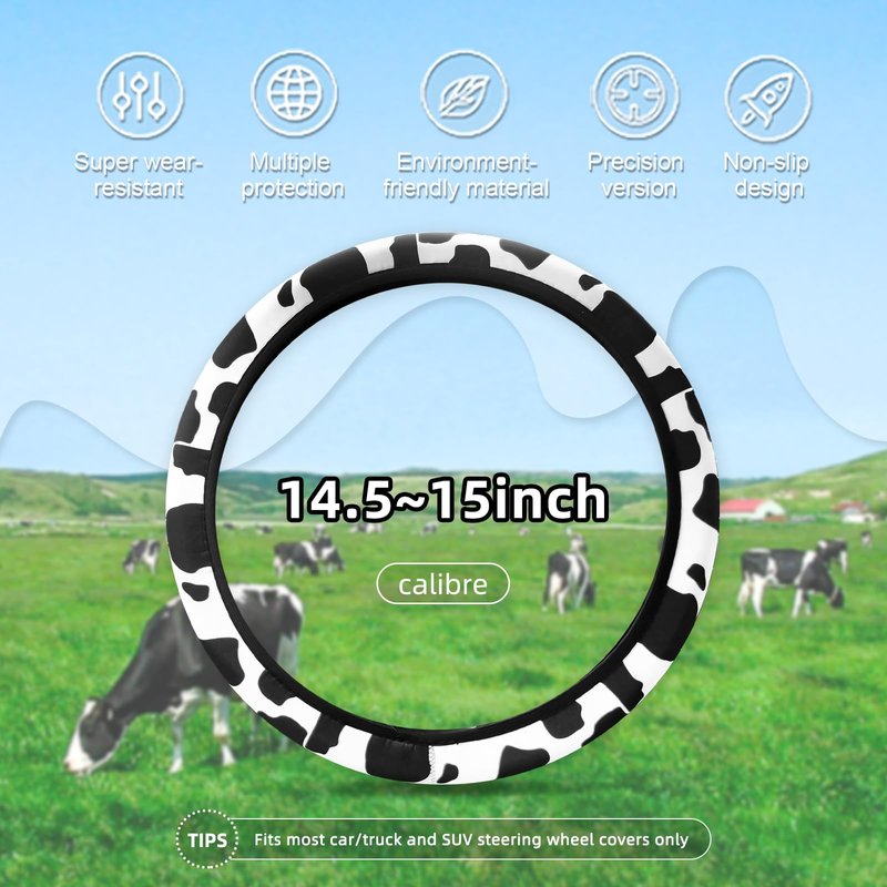 - 😆Universal 15 inch Size:Please carefully measure the size of your steering wheel before purchasing. Our cute cow print steering wheel covers Car Accessories universal diameter 14.5-15 inch,suitable for most car steering wheels.