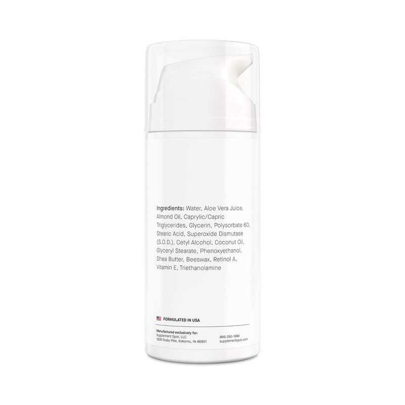 Supplement Spot’s SOD Anti-Aging Face Cream for Women & Men: Looking for a fine lines and wrinkles. Say “Hello” to our S.O.D women’s and mens face cream! Our day and night cream for women anti aging skincare is one solution for all your skin problems. This facial moisturizer for women and men helps to support skin radiance. All the ingredients in these facial skin care products add extra hydration and provide nourishment to the skin. To see visible results, apply this anti wrinkle face cream twice daily on your face to help restore your skin’s youthfulness. --- Ingredients: Deionized Water, Aloe Vera, Almond Oil, Caprylic/Capric Triglycerides, Glycerin, Polysorbate 60, Stearic Acid, Superoxide Dismutase, Cetyl Alcohol, Coconut Oil, Glyceryl Stearate, Phenoxyethanol, Shea Butter, Beeswax, Retinol A, Vitamin E, Triethanolamine --- About Supplement Spot: For over 11 years, we have been working tirelessly in delivering the right products for you. We never compromise on our quality and affordability. Our products go through a rigorous review process before reaching you. --- Caution: For external use only. Do not use facial moisturizers on sores or wounds. Discontinue use if irritation develops. Avoid contact with eyes.