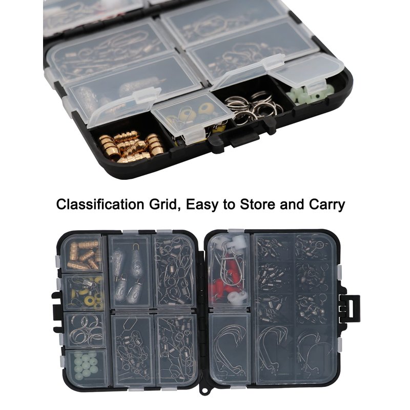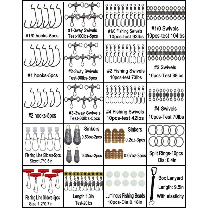 - INCLUDED - The fishing tackle box set comes with 140pcs necessary fishing accessories: Fishing Hooks, Sinkers, Rolling Swivels, Three way cross-line fishing swivels, Fishing Line Sliders, Clip Connector and Fishing Beads etc. suitable for all sorts of fishing conditions.