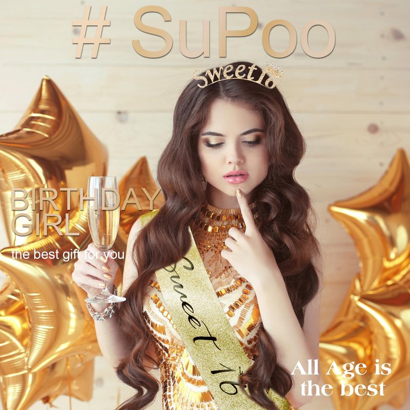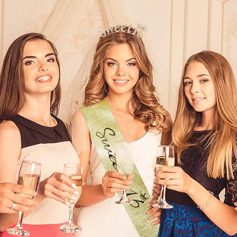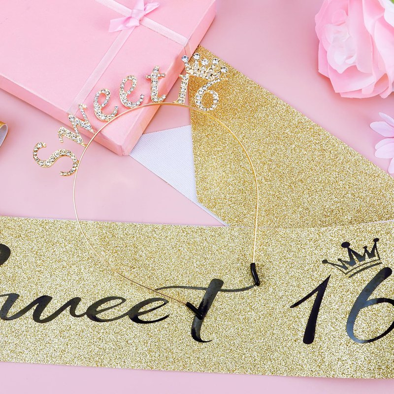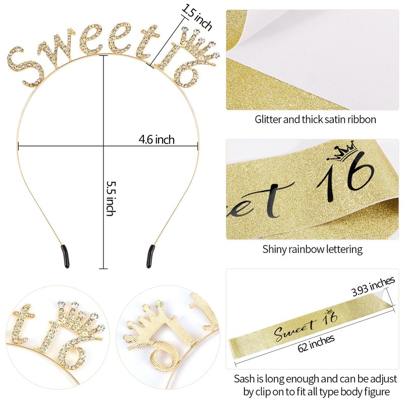 SuPoo 16th Birthday Crown and Sash Kit Gold Sweet 16 Tiara Headband 16th Birthday Decorations for Girls Sweet 16 Sash Happy Sixteen Party Decorations Party Favors Birthday Girl Headband