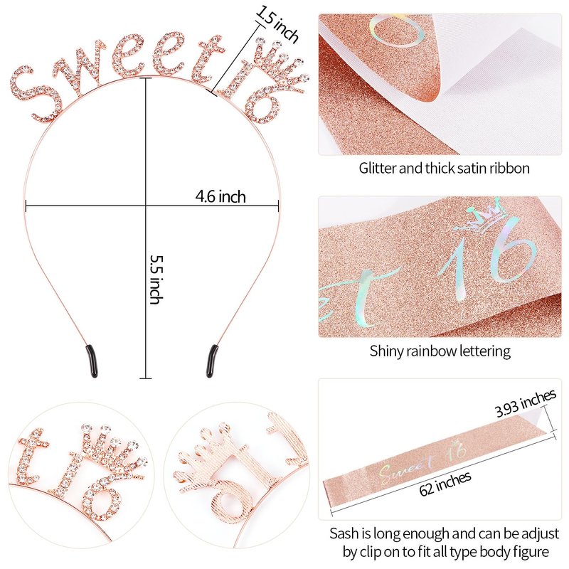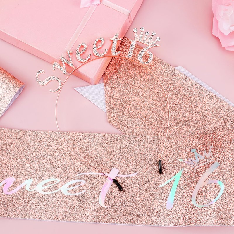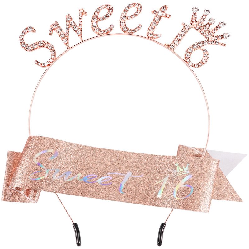 SuPoo 16th Birthday Crown and Sash Rose Gold Sweet 16 Tiara Headband 16th Birthday Decorations for Girls Sweet 16 Sash Happy Sixteen Party Decorations Party Favors Birthday Girl Headband