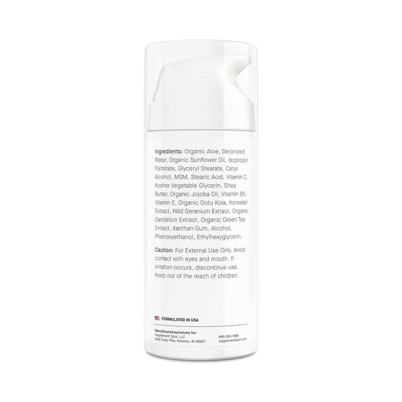 Organic Aloe, Deionized Aqua, Organic Sunflower Oil, Isopropyl Palmitate, Glyceryl Stearate, Cetyl Alcohol, MSM, Stearic Acid, Vitamin C, Kosher Vegetable Glycerin, Shea Butter, Organic Jojoba Oil, Vitamin B5, Vitmain E, Organic Gotu Kola, Horsetail Extract, Wild Geranium Extract, Organic Dandelion Extract, Organic Green Tea Extract, Xanthum Gum, Alcohol, Phenoxyethanol, Ethylhexyglycerin.