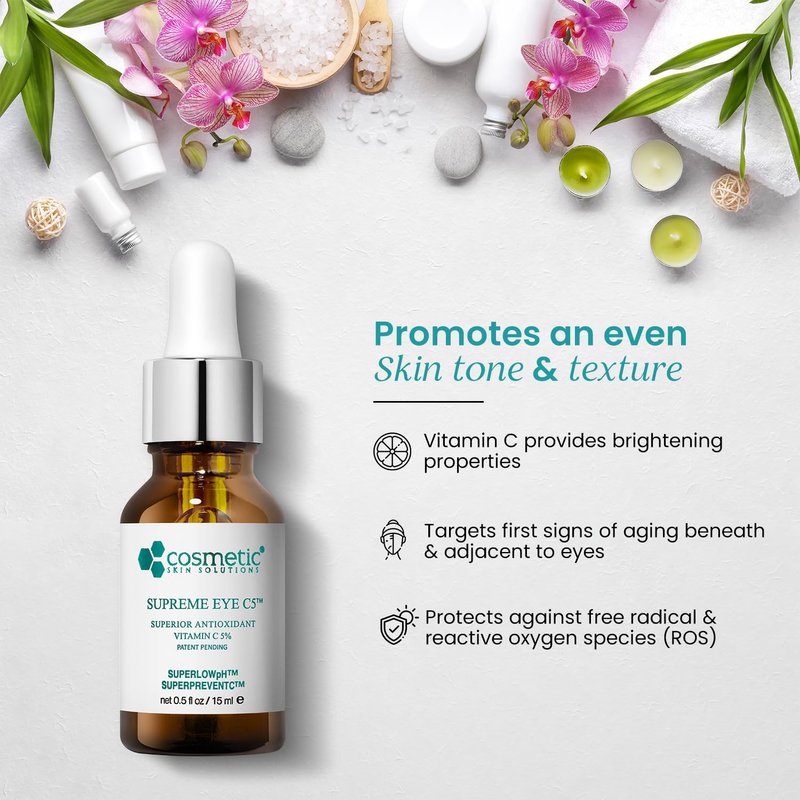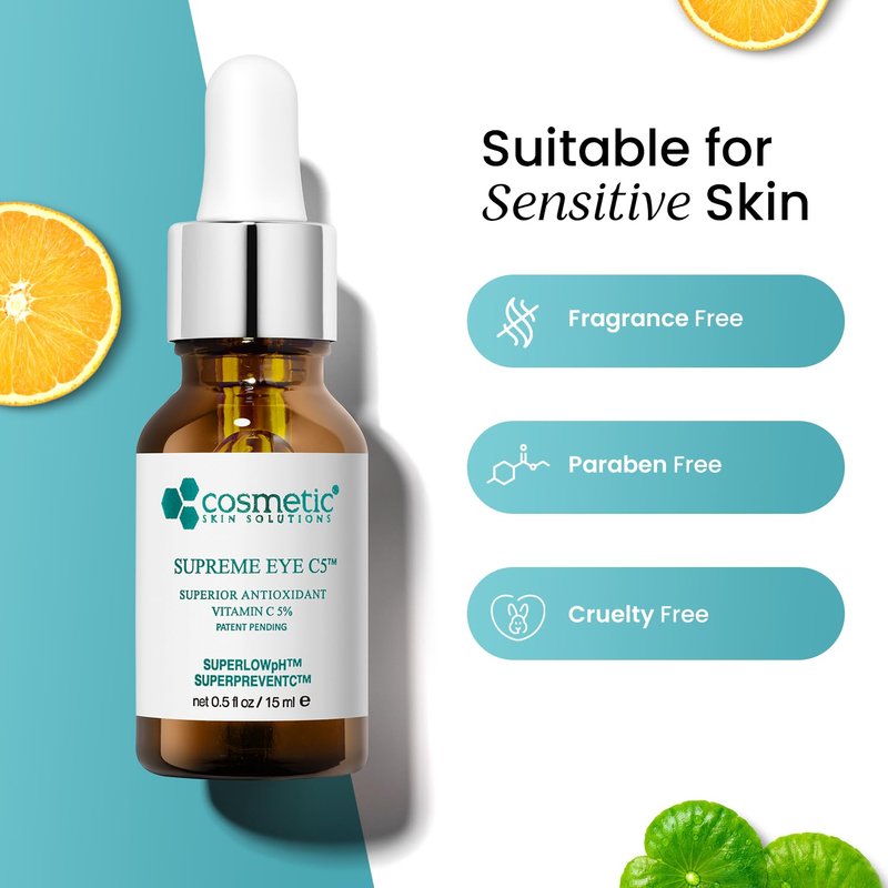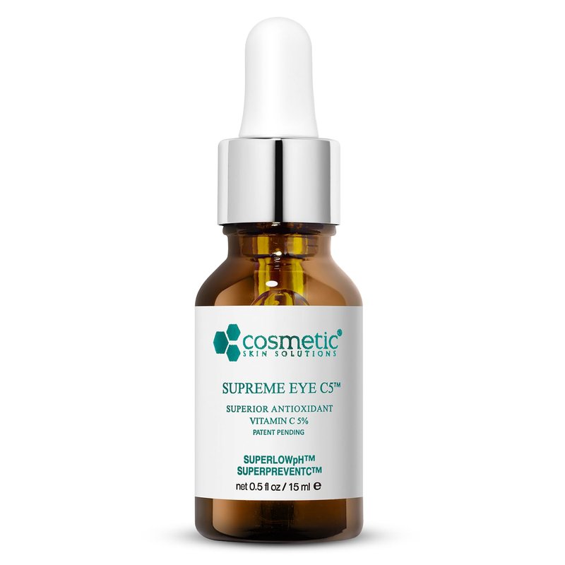 - Cosmetic Skin Solutions Supreme Eye C5 Eye Gel uses a 5% concentrated Vitamin C, Hyaluronic acid and Asiatic acid to energize tired-looking eyes without the heaviness of an eye cream