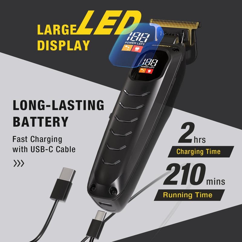 - Universal USB-C Charging: The SUPRENT hair trimmer features a versatile USB-C charging port for effortless power-ups. Simply connect the beard trimmer to your laptop, phone charger, or power bank to quickly recharge, ensuring you're always ready for a grooming session without worrying about battery life.