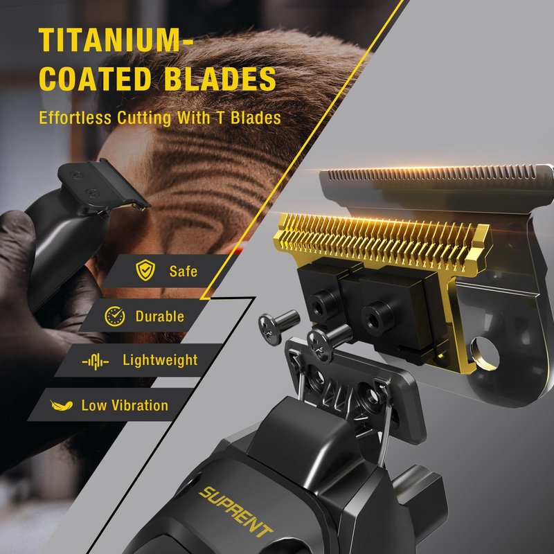 - Blazing Fast Motor & Sharp Titanium Blades for Effortless Cuts: The SUPRENT trimmer features a powerful 6000RPM motor which provides you with a professional-grade trimming experience. Its precision-engineered titanium blades effortlessly glide through even the thickest hair, delivering a salon-quality hair trimming every time. With the sharp, durable titanium blades, our cordless trimmer for men allows for a clean precise cut without snagging or pulling your hair. This trimmer for men is perfect for achieving a variety of styles, from detailed fades to beard trimming.