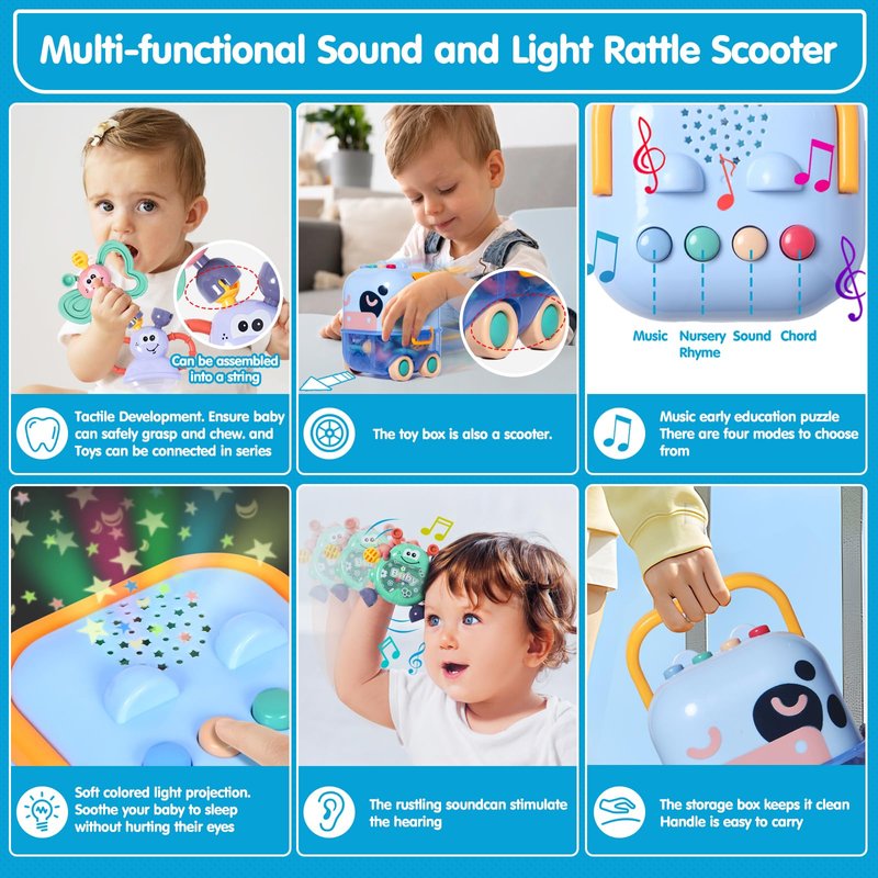 - Multi-functional Push Car Design: This push car with wheels and a handle is both a toy and a storage box. Babies can push the car around the living room, enjoying the mobility and fun. The design allows the toys to be strung together and hung on strollers, cribs, or car seats, adding more playtime fun. Watch your baby push the car, listen to nursery rhymes and melodies, and manipulate the toys with dexterous fingers, giving parents a moment of relaxation and satisfaction.