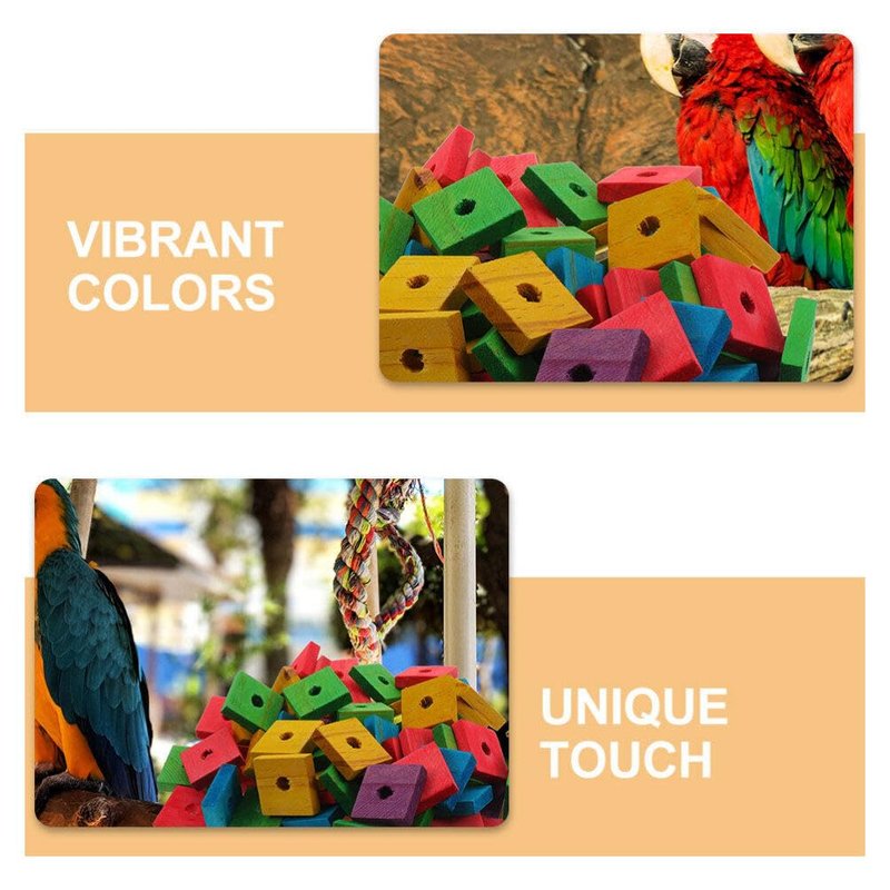 Transform your bird's cage into a playground with our colorful Wooden Blocks Bird Chewing Toy. These charming mini wood chips are not to play with but also aid in keeping your bird's beak well-trimmed and feet exercised. Ideal for crafting unique shredding toys, they provide endless entertainment for your winged companion.