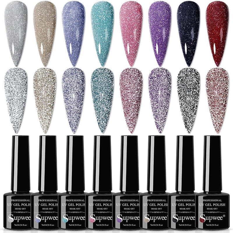 SUPWEE Reflective Gel Polish Set Diamond Glitter Gel Nail Polish Disco Shiny Nail Polish Soak Off UV Gel Manicure Nail Salon Gift Kit 8 Colors 7ml(0.24fl.oz)