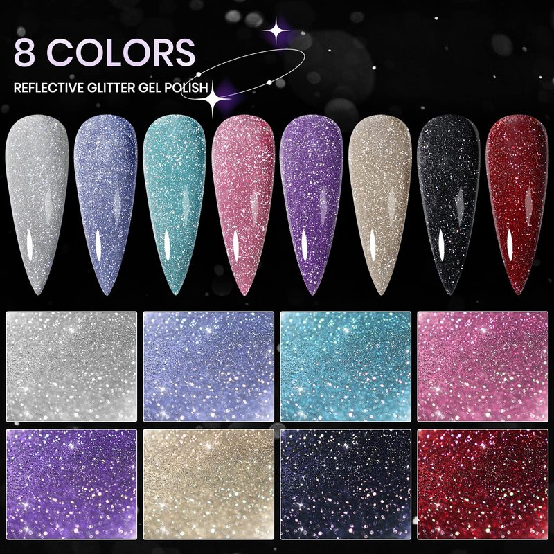 - Reflective Glitter Gel Polish Set: You will get 8 colors of Reflective Diamond Gel, they can reflect under the flashlight, you will be amazed by these effects