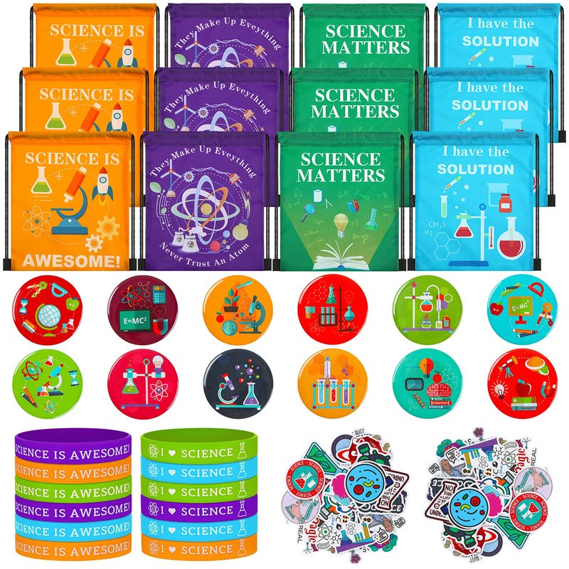 - Scientific Party Favors: you will receive 12 scientific drawstring bags, 12 scientific wristbands, 12 scientific buttons pins and 50 scientific stickers, a total of 86 pieces, plenty of party supplies are enough to meet your needs