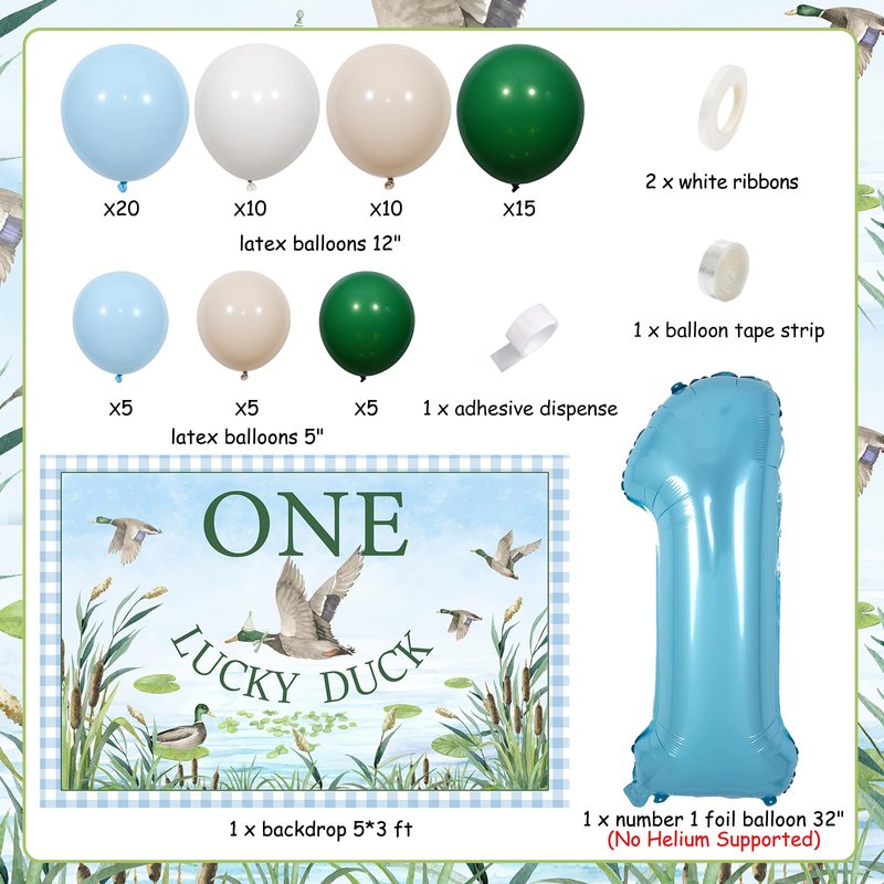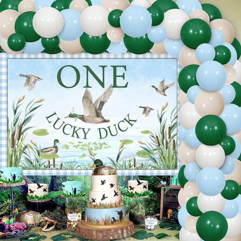 One Lucky Duck Birthday Decorations, One Lucky Duck Balloon Garland Arch Kit with Photography Background, Duck Hunting First Mallard Duck 1st Birthday Party Supplies