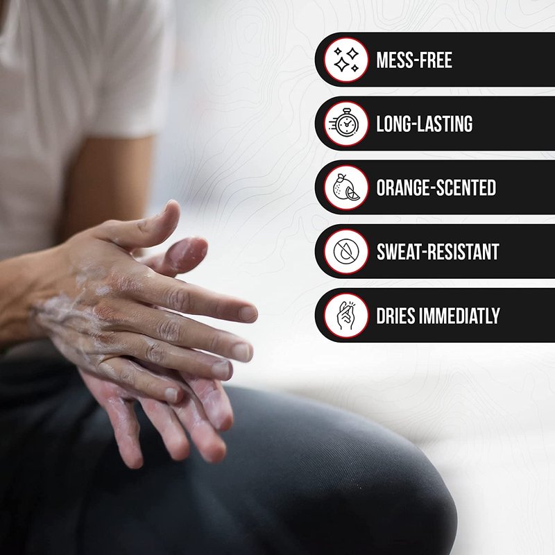 - ✔️MESS FREE AND EFFECTIVE - Don't be the person who leaves a puddle of chalk on the floor. With this type of workout chalk, no one will ever know you were using gym chalk in the first place. All 100% of our grip chalk stays on your hands, instead of going all over your clothes and on the floor. It's the most effective and cleanest climbing chalk and lifting chalk there is!