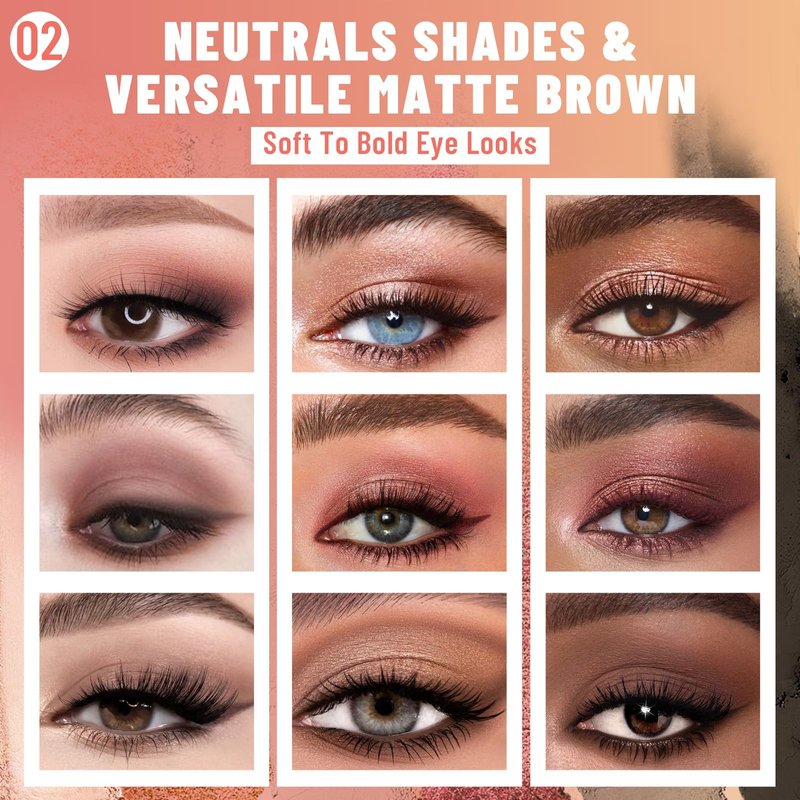 - 【Create Looks for All Occasions】This nude eye shadow palette allows you to effortlessly create a variety of eye-catching looks for any occasion. Whether you prefer a subtle, everyday elegance or a bold, smokey eye, it has you covered. The matte & shimmer finish of the shades adds depth and dimension to your eyes, enhancing their natural beauty.