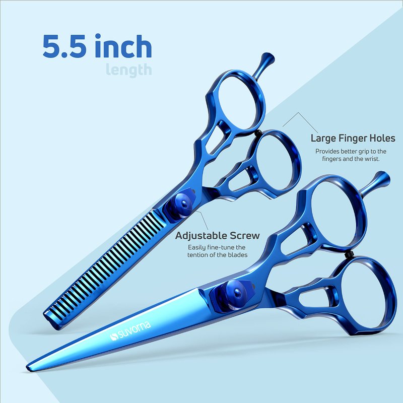 - 💎 RAZOR SHARP HAIR SHEARS SET: Suvorna's 5.5" perfect size design reduces strain on your elbows and wrists, letting you cut for longer without discomfort. Our razor-sharp, convex blades glide effortlessly through hair, eliminating hair bending and pushing. Tension adjustment helps cut at your ease & large finger holes with rubber inserts suitable for both small and big hands. The hollow ground blades ensure clean snips, increasing cutting efficiency and facilitating precision cuts.