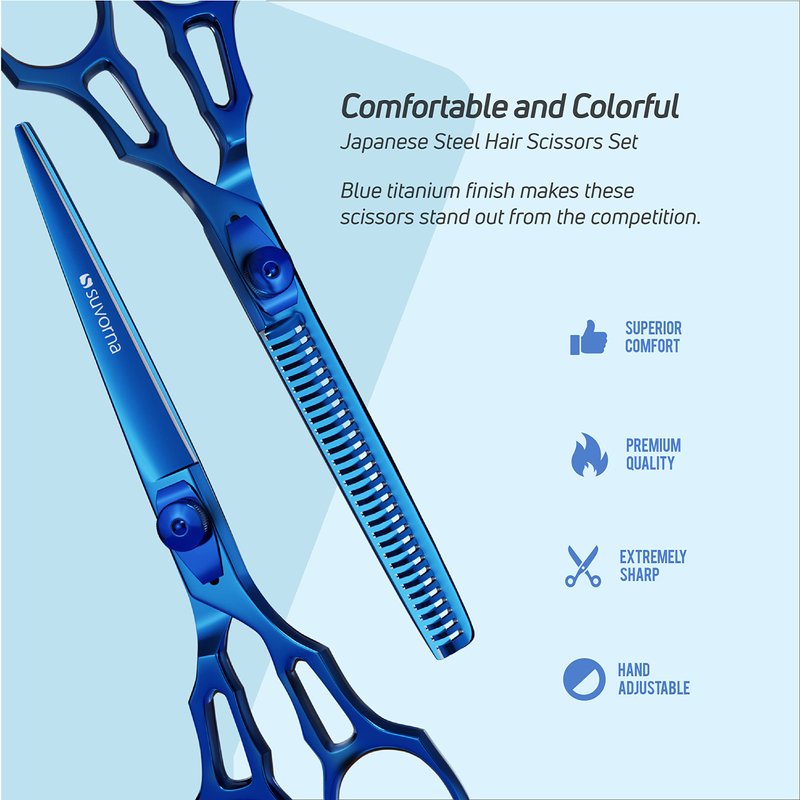 - 👩🏻💼 AMERICAN FEMALE-OWNED BRAND: Suvorna is an American female-owned brand. Unlike other brands sourcing from China, each pair is hand-finished in our manufacturing units. Skilled artisans mold the finest quality 420 stainless steel into a sleek, ergonomic design. Each hair cutting scissors kit is then hand-polished for a touch of luxury, Every pair undergoes strenuous quality assurance tests to give the confidence to offer a lifetime warranty against any manufacturing defects.