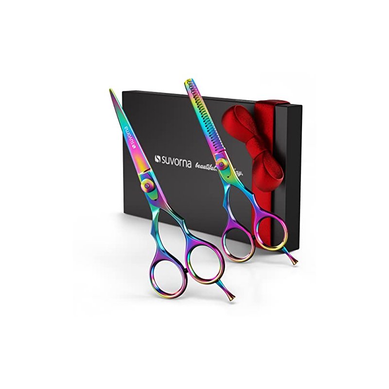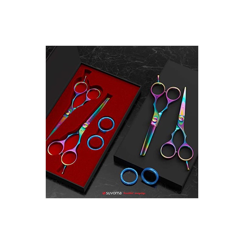 - 👩🏻💼 AMERICAN FEMALE-OWNED BRAND: Suvorna is an American female-owned brand. Unlike other brands sourcing from China, each pair is hand-finished in our manufacturing units. Skilled artisans mold the finest quality J2 420 stainless steel into a sleek, ergonomic design. Each hair cutting scissors kit is then hand-polished for a touch of luxury, Every pair undergoes strenuous quality assurance tests to give the confidence to offer a lifetime warranty against any manufacturing defects.