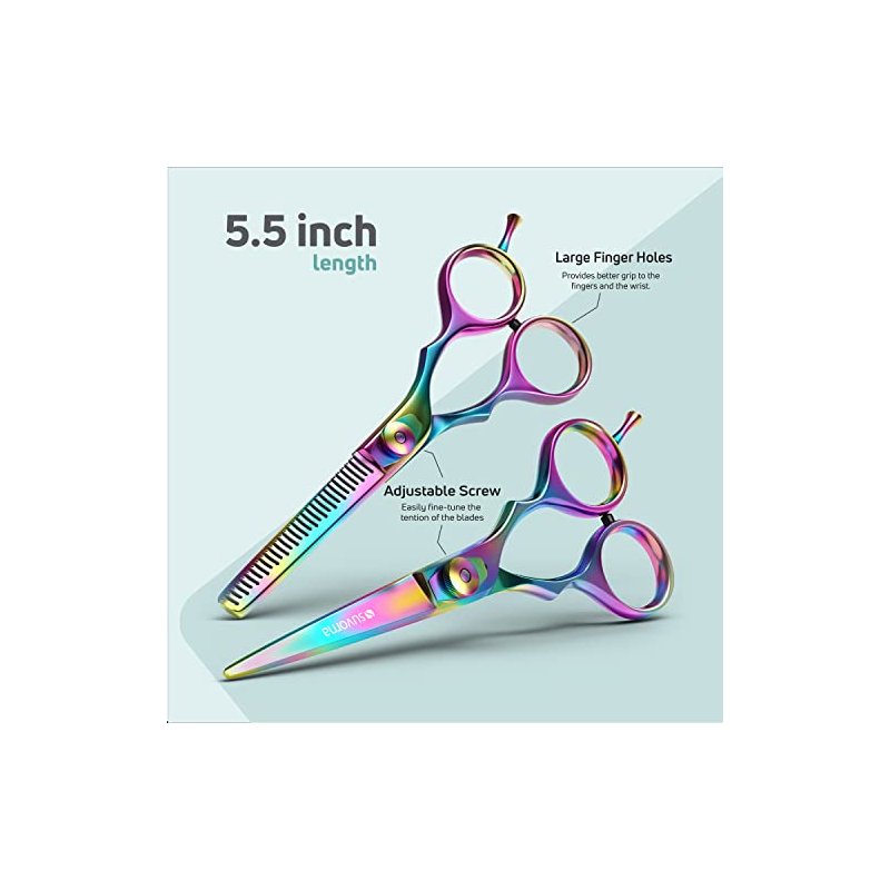 - 💎 RAZOR SHARP HAIR SHEARS SET: Suvorna's 5.5" perfect size design reduces strain on your elbows and wrists, letting you cut for longer without discomfort. Our razor-sharp, convex blades glide effortlessly through hair, eliminating hair bending and pushing. Tension adjustment helps cut at your ease & large finger holes with rubber inserts suitable for both small and big hands. The hollow ground blades ensure clean snips, increasing cutting efficiency and facilitating precision cuts.