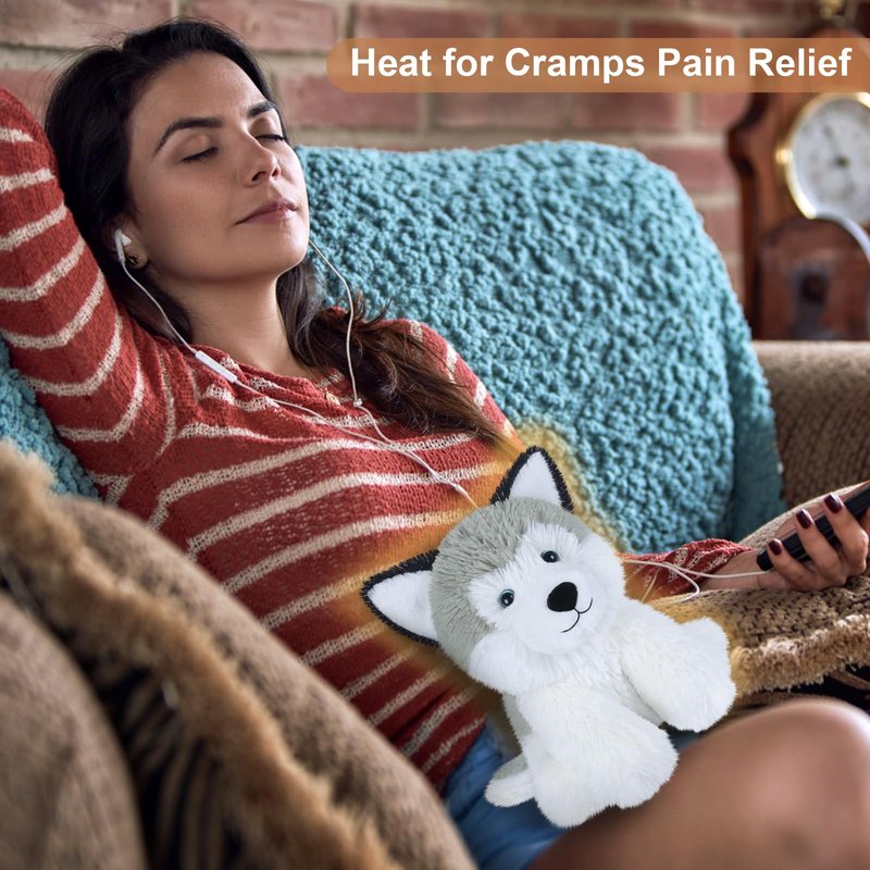 - Relieve Periodic Discomfort: If you're experiencing menstrual cramps, try this menstural heating pad for period cramps relief! By cuddling up to this husky cute stuffed animals, the dog heating pad animal delivers up to 20 minutes of deep, moist heat to provide relief for pain in your lower abdomen and all over your body, boosting circulation and easing menstrual cramps, making it a great heated plush dog period heating pad gift for girls and women
