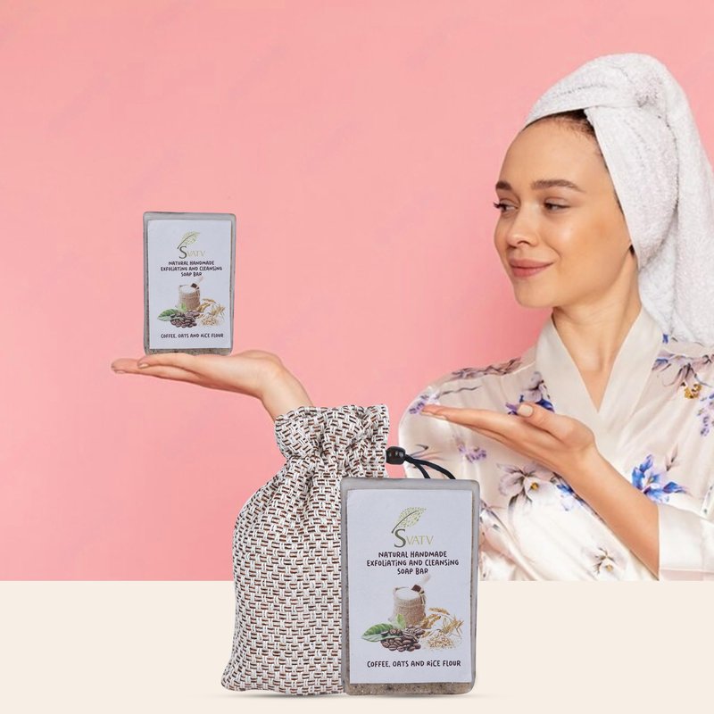 SVATV HANDMADE COFFEE OATS RICE FLOUR SOAP Get the ultimate SVATV natural soap bar from a range of handcrafted soaps from Svatv. Each Soap bar is unique, and soothing for your skin. The key to the Svatv Soap Collection is it’s perfect design. Each soap bar is truly a work of natural beauty, it is handcrafted for you and all your skin nourishment needs. They are carefully designed with the perfect blend of natural & herbal ingredients. Each handmade soap bar is created with a different vision in mind, allowing you to sample some of nature’s finest bounty. Each bar generates a rich, creamy lather that leaves your skin, intensely hydrated and nourished. The dreamy, natural scents are absolutely to die for. These make for an absolutely revitalizing, indulgent at-home spa set. They are pH balanced and cruelty free. The combined effect of these ingredients clears the skin and gives a natural glow, while fighting with degenerated skin. It produces a rich emollient lather that is good for all skin types. The scent is refreshing and will leave you with a fresh feeling for the rest of the day. The soap is great for exfoliating, cleansing, energizing, soothing and moisturizing skin soap. SVATV HANDMADE Soap Choose from a variety of handmade soaps. Crafted with CARE , Naturally PURE All-natural handcrafted soaps made with recycled flowers, complemented by the nurturing properties of vitamin E and essential oils for everyday indulgence. At Svatv , we champion empowerment through artisanal craftsmanship and sustainability. Each bar is a testament to our commitment to harnessing the power of nature responsibly. Usage: For external use only Store in a cool, dry place for freshness.