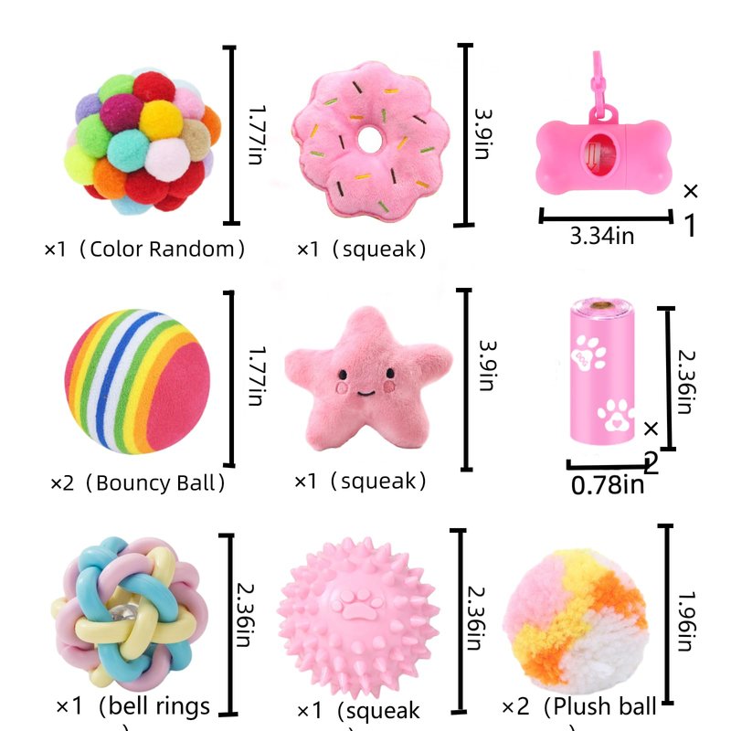 - Cute Pink Cat Toys for Female cat:Perfect for suitable for cats of all ages, including 2 puff balls, 1 bell ball, 2 red rainbow cat toy balls, 2 squeaky plush toys, 1 wool cat toy ball, 2 extra poop bag rolls and 1 dispenser. And this set features a pink design, creating princess-like happiness for your lovely cat.