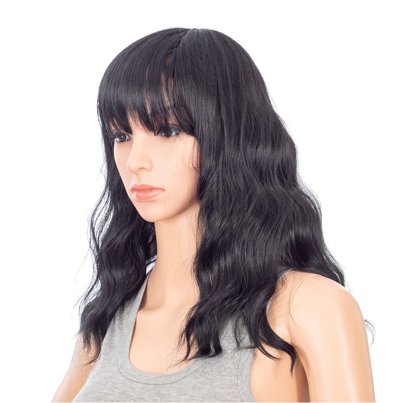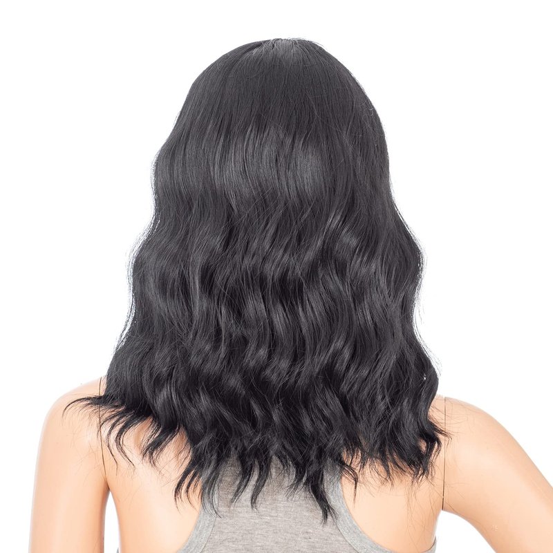 SWACC Short Curly Wavy Bob Wig with Bangs Synthetic Medium Shoulder Length Hair Wig for Women with Wig Cap (Black-1B)